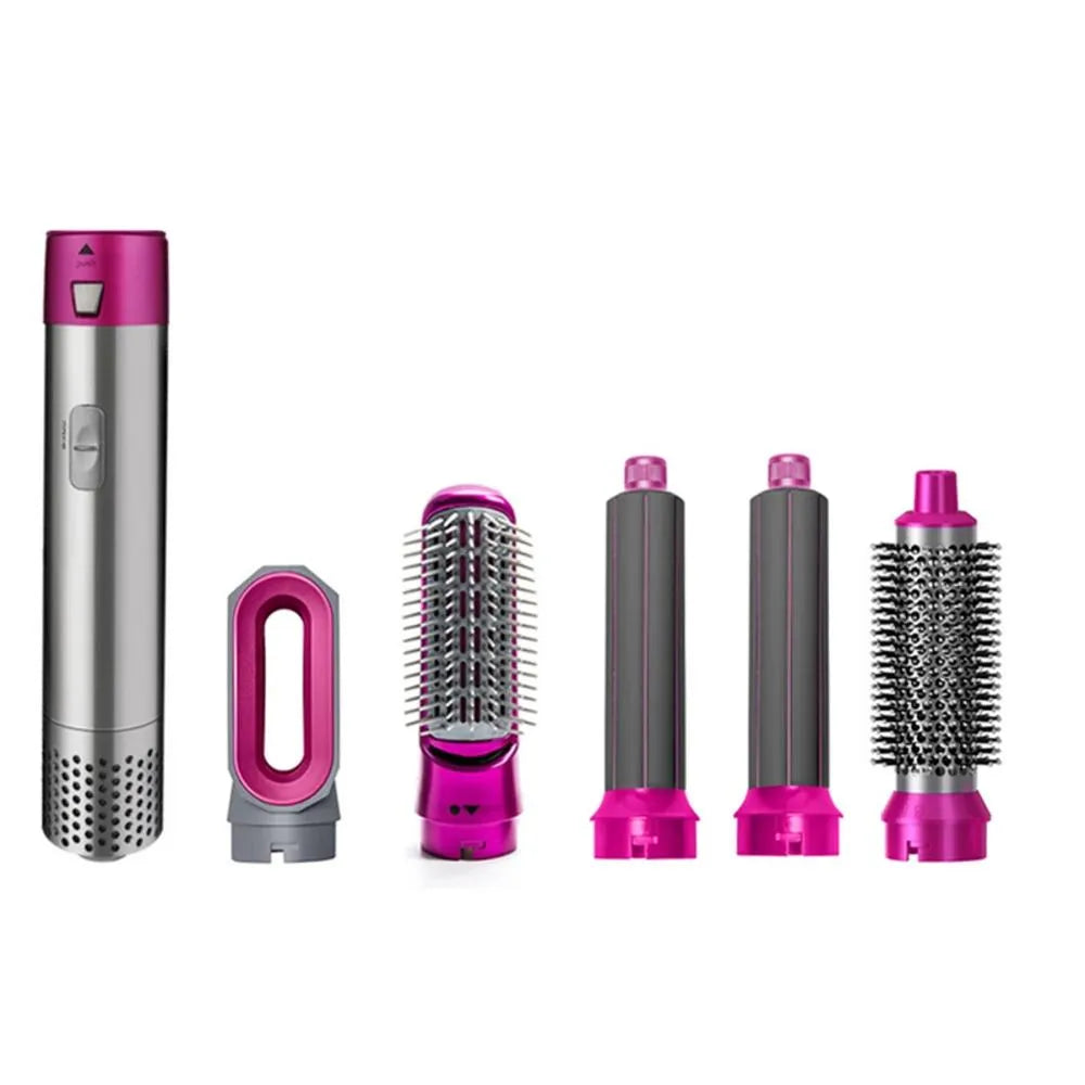 Secador y estilizador de pelo 5 en 1. Incluye 2 cilindros para rizar y ondular en ambas direcciones, dos cepillos, uno para alisar y controlar el frizz y otro para hacer brushing y dar volumen, además de un secador multifuncional para secar y ocultar el friz.